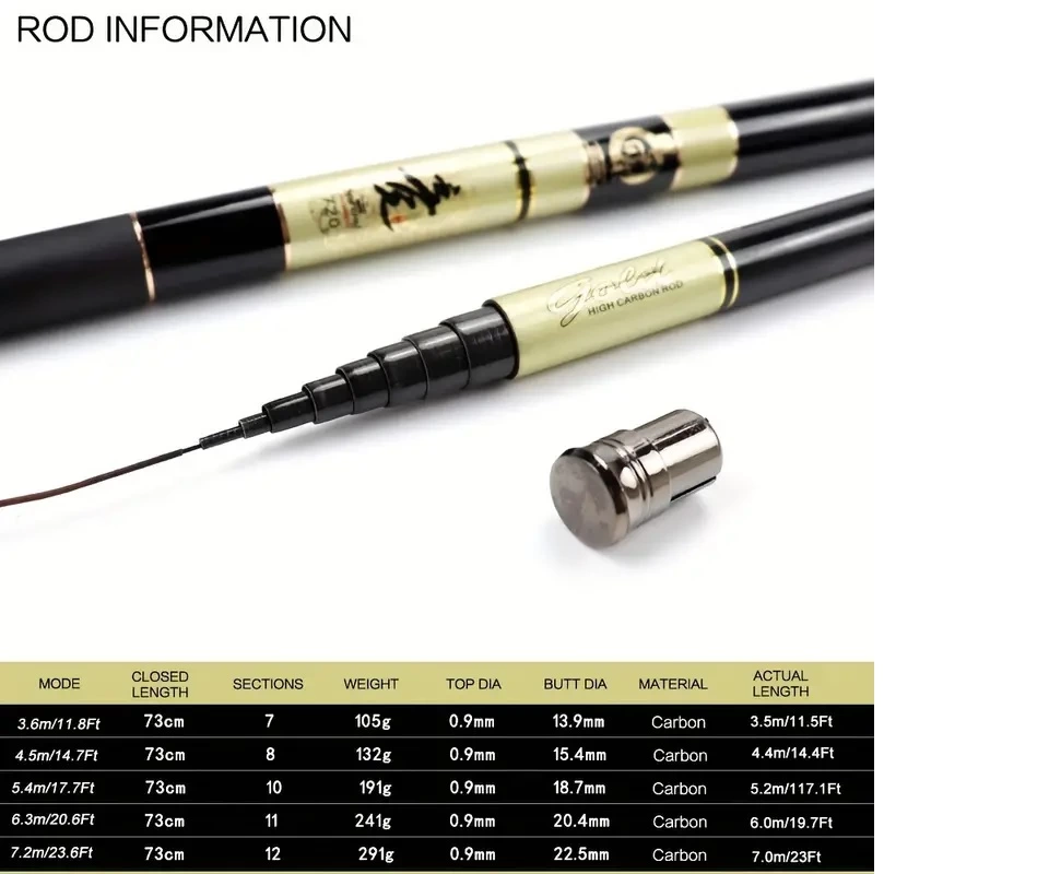 Ultra Hafif Karbon Fiber Teleskopik Balıkçılık Çubuğu - Ayarlanabilir Uzunluk 291.36cm'den 7.2 metreye, Ta