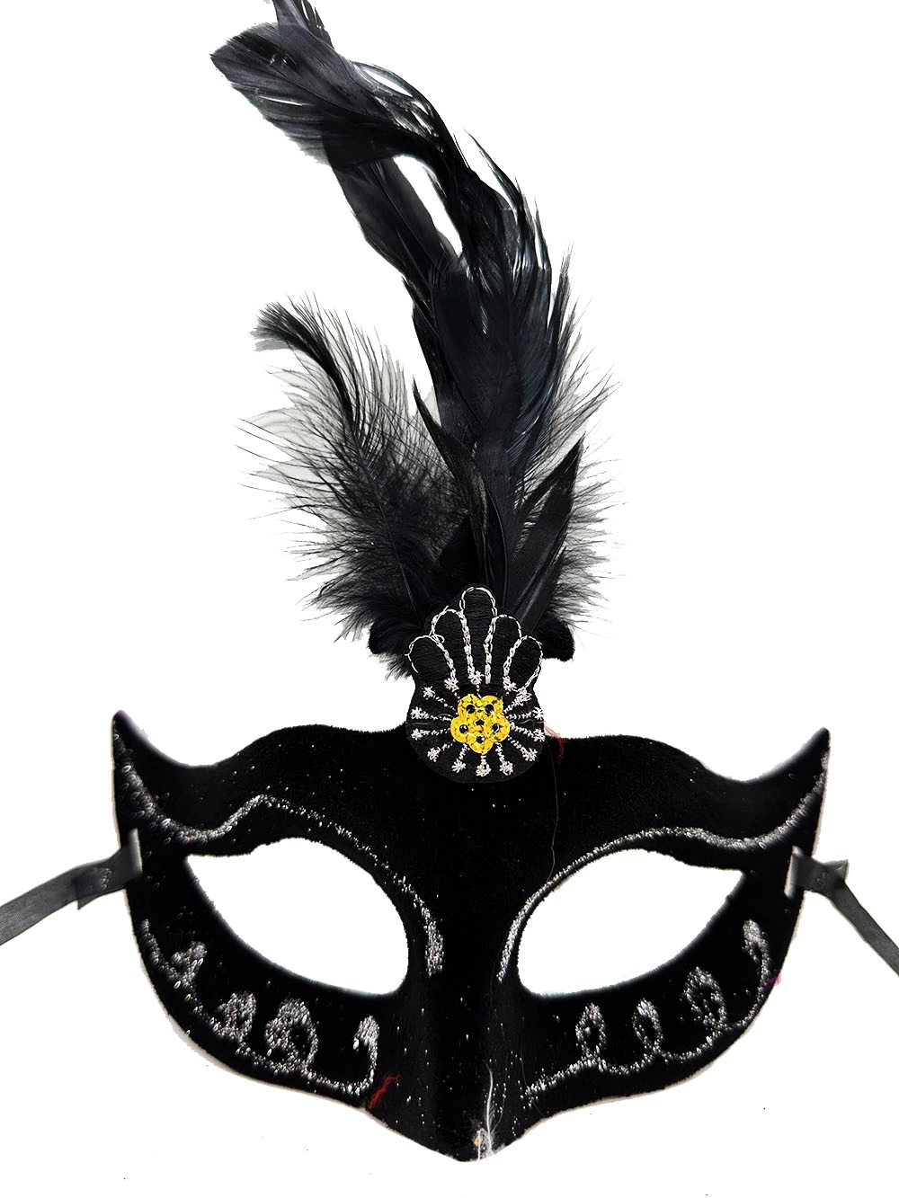 Siyah Renk Tüylü Siyah Süet Kaplama Parti Balo Maskesi, balolar, maskeli partiler veya kostüm partileri gibi özel günlerde gizemli ve karizmatik bir görünüm elde etmek isteyenler için mükemmel bir seçimdir. Siyah süet kaplaması ve yandan sarkan tüyleri ile bu maske sizi partinin en gizemli ve karizmatik konuğu yapacak.